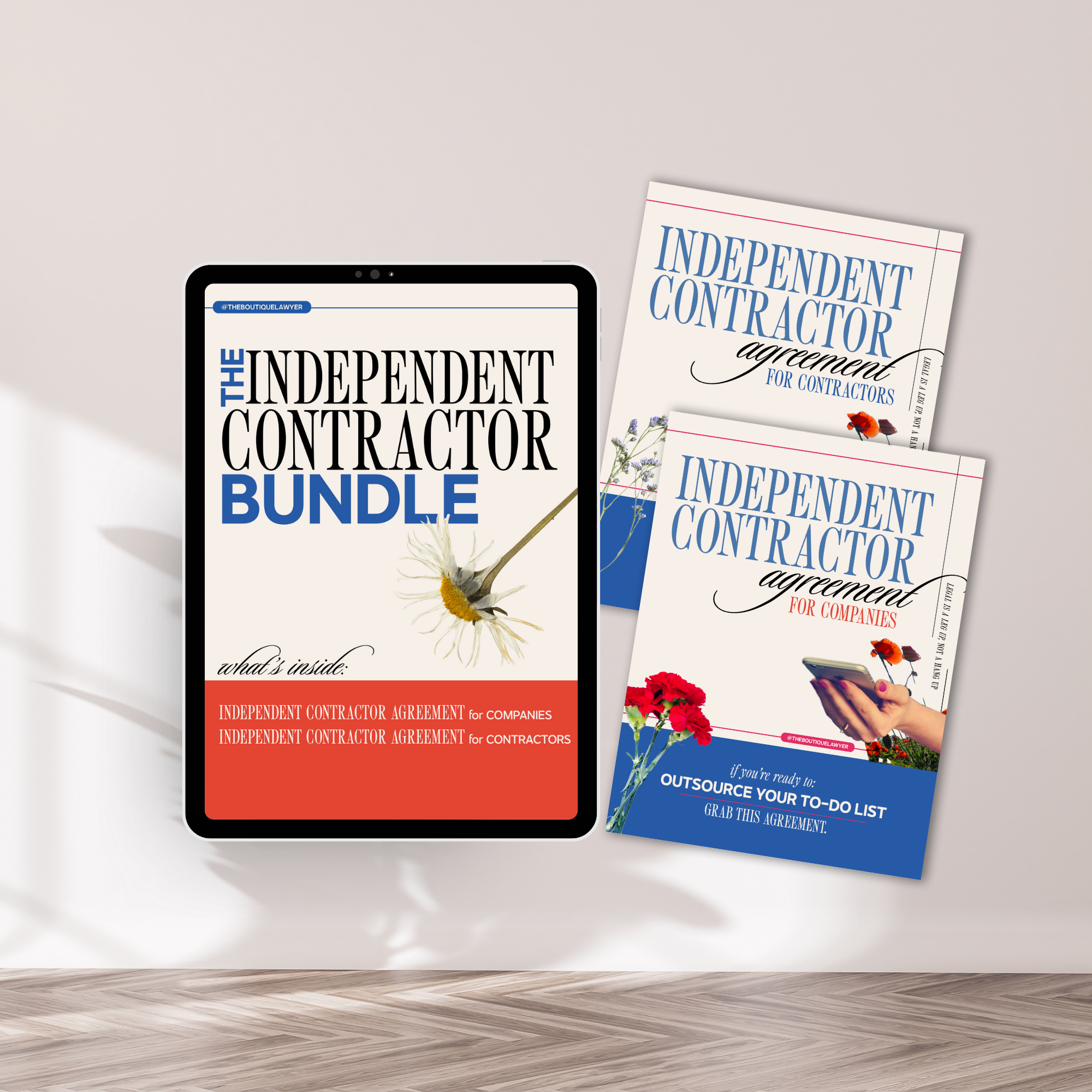 A tablet displaying "THE INDEPENDENT CONTRACTOR BUNDLE" document with a flower, listing contents including an Agreement for Companies and an Agreement or Contractors, with a stylus beside it.