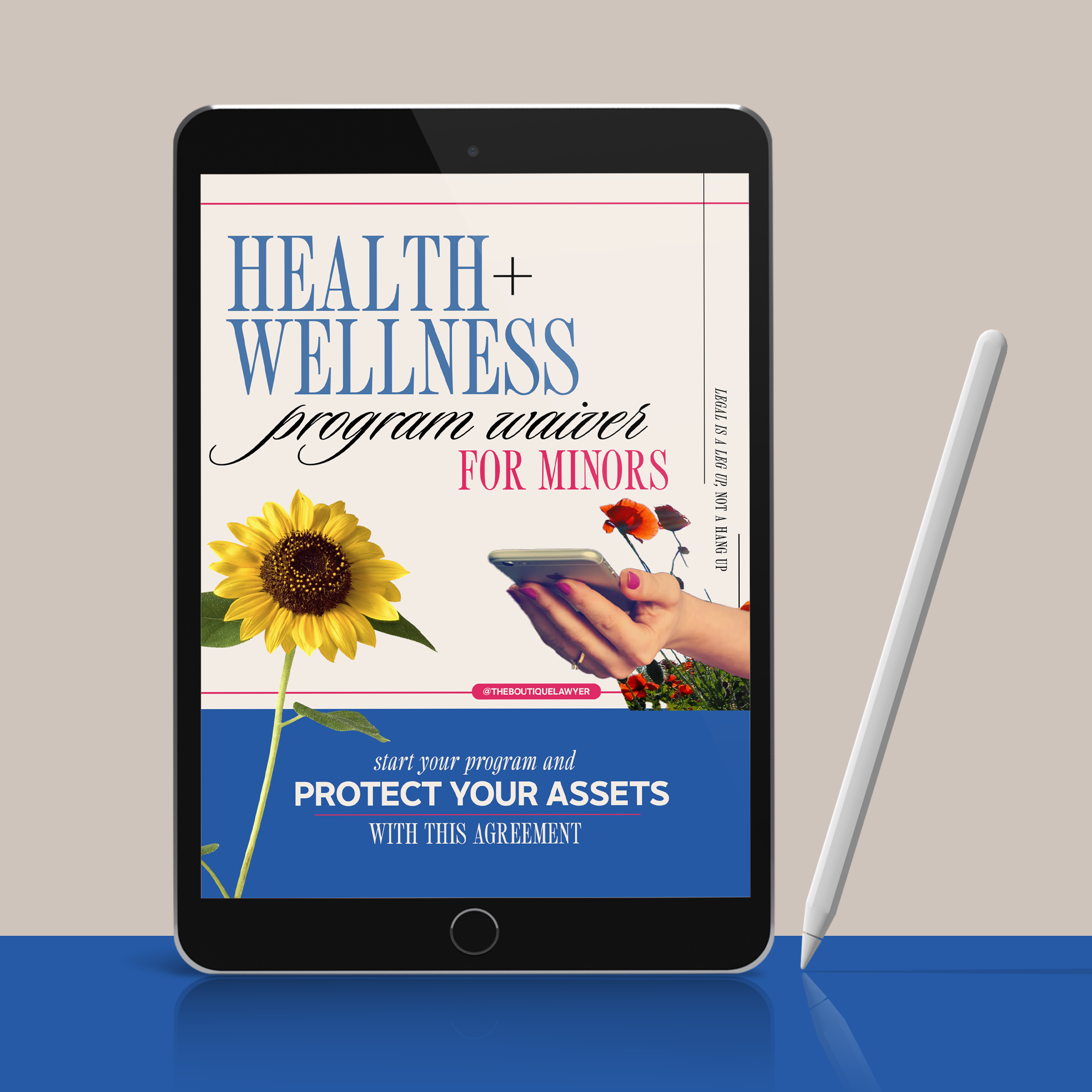 Digital tablet displaying a "Health + Wellness program waiver" with flower and a hand holding a phone, stylus beside it.