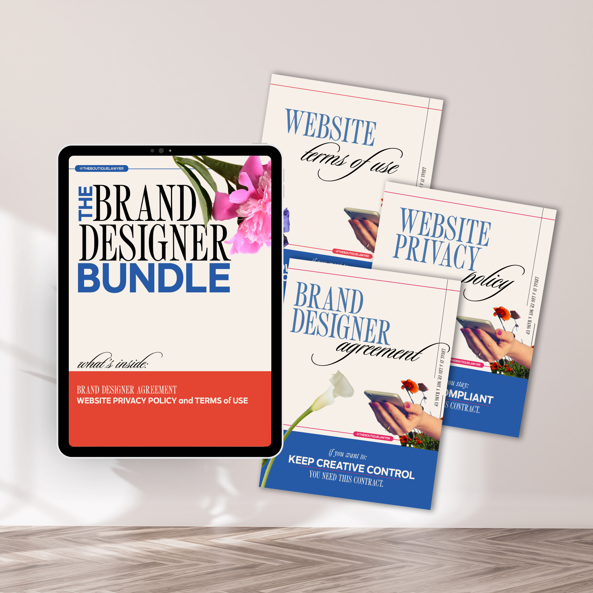 A tablet displaying "THE BRAND DESIGNER BUNDLE" document with a flower, listing contents including an Agreement, Website Privacy Policy and Terms of Use, with a stylus beside it.